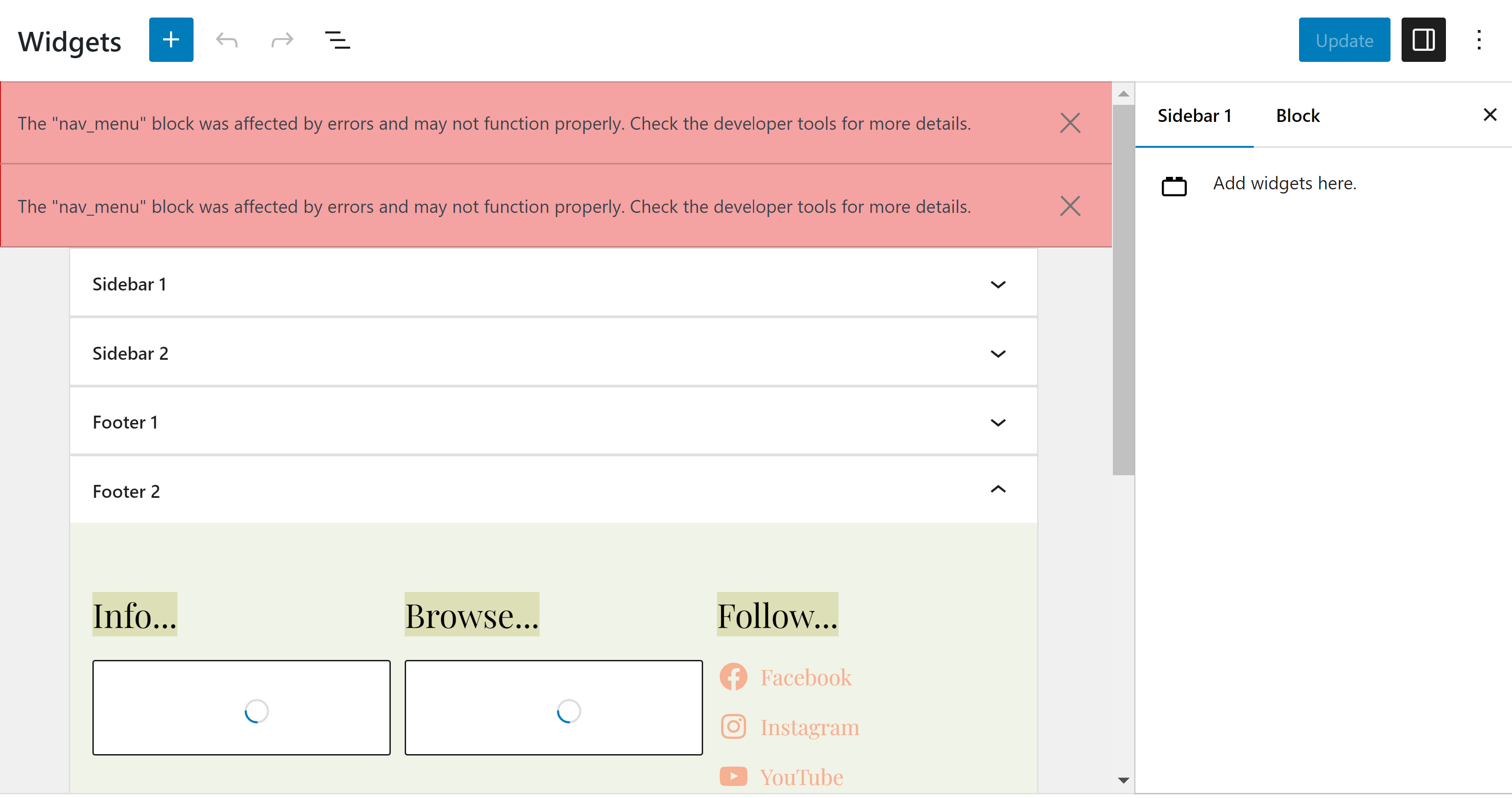 I purchased the Hello Blogger theme and am having issues updating the menu in the footer areas (Info and Browse…) I also have 2 error messages that showed up. I’ve attached a screenshot of the error messages.