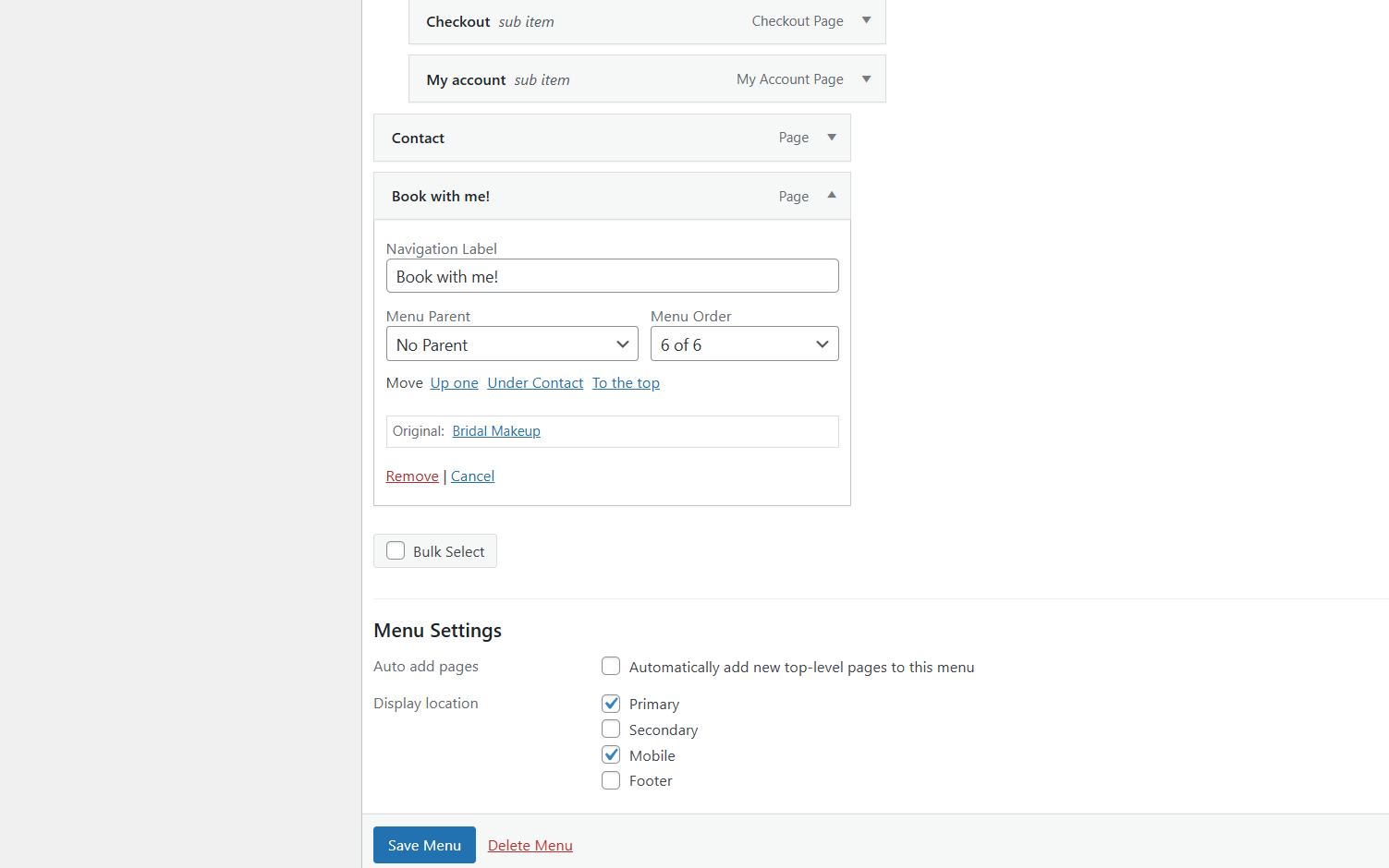 I have the Hello Iris theme, I wondered how I change the link for the book with me option to a different page? It’s currently set to Bridal Makeup but I would like it changed to my online booking system, but I want to keep the format of the wording and colour etc.